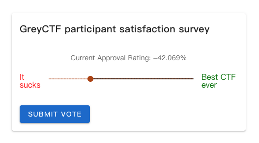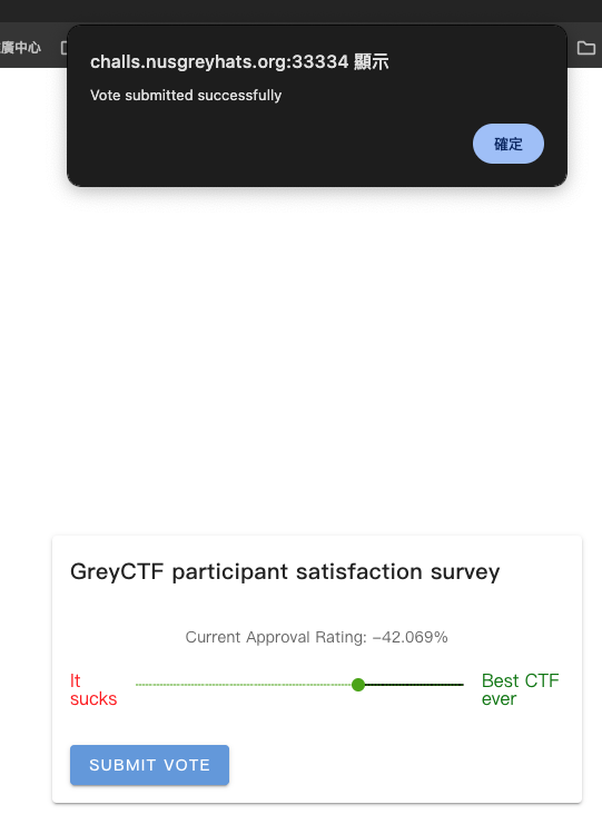 /vote那邊看過去,果然應證了我的猜測,在第 29 至第 42 行之間,顯示了出現flag的方法:讓score > 1就可以了。jsif(vote < 1 && vote > -1) { score += parseInt(vote); if(score > 1) { score = -0.42069; return res.status(200).json({ "error": false, "msg": config.flag, }); } return res.status(200).json({ "error": false, "data": score, "msg": "Vote submitted successfully" }); }已經可以從第 12 行知道