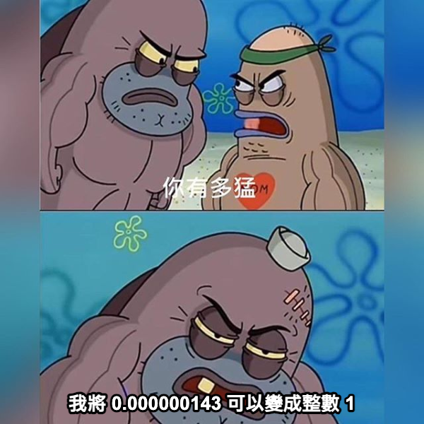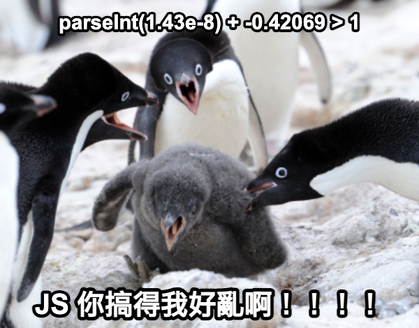 這串數字,會在 toString的助攻之下轉變成"1.43e-7",然後在轉換成整數的過程中,因為.不是數字,因此後面的東西通通被省略,也就留下了數字1當成被轉換後的結果。因此parseInt(0.000000143)的輸出結果會變成1。