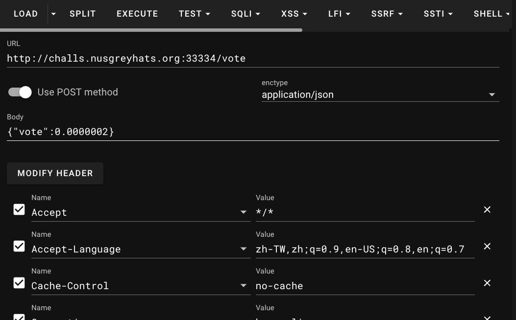 翻車的特性,我使用Hackbar這個 chrome 擴展,利用Network頁面將請求封包轉成 cURL 格式再餵進Hackbar中,送入精心調製的POST BODY,就得到答案了。